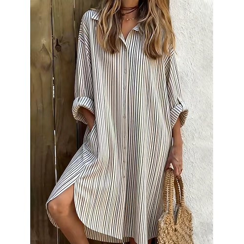 Per donna Abito al ginocchio Abito a Tubino Vestito Casual Moda Moderno Quotidiano Vacanza Uscire Vestibilità comoda Floreale A righe Manica Lunga Colletto a Camicia Blu Rosso Marrone Cachi Primavera