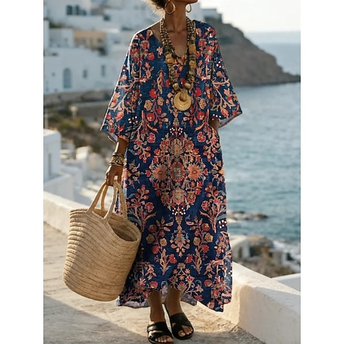 Per donna Abito maxi Vestito Estivo Abito a trapezio Vacanza Casual Boho Spiaggia Uscire Vestibilità comoda Floreale Grafico Geometrico Manica Lunga Scollo a V Blu reale Verde Cachi Beige Estate
