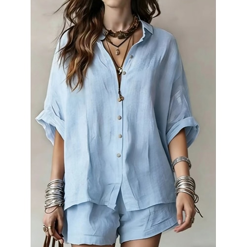 Per donna Set di biancheria in cotone Set di Pantaloncini Manica Corta Colletto a Camicia Semplice Moda Streetwear Casuale Quotidiano All'aperto Nero Bianco Rosa Estate Vestibilità comoda