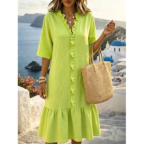 Per donna Abito al ginocchio Abiti di lino Abito in lino Essenziale Spiaggia Vacanza Vestibilità comoda Colore Puro Mezza Manica Scollo a V Verde Estate