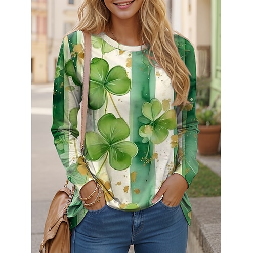 T-shirt da donna per il giorno di San Patrizio con trifoglio elegante casual a maniche lunghe colletto regolare stampe quotidiane verde e bianco sporco primavera autunno