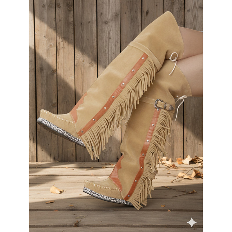 Women's Fringe Over The Knee Boots - Tan Suede Western Boho Style Boots for Autumn Winter