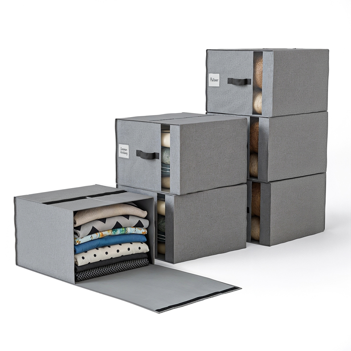 Björn&Schiller Aufbewahrungsboxen für Kleidung – 6er Set, 39×36×26 cm, 37 L, Leinenstoff, Sichtfenster, Fixiergurte, Grau