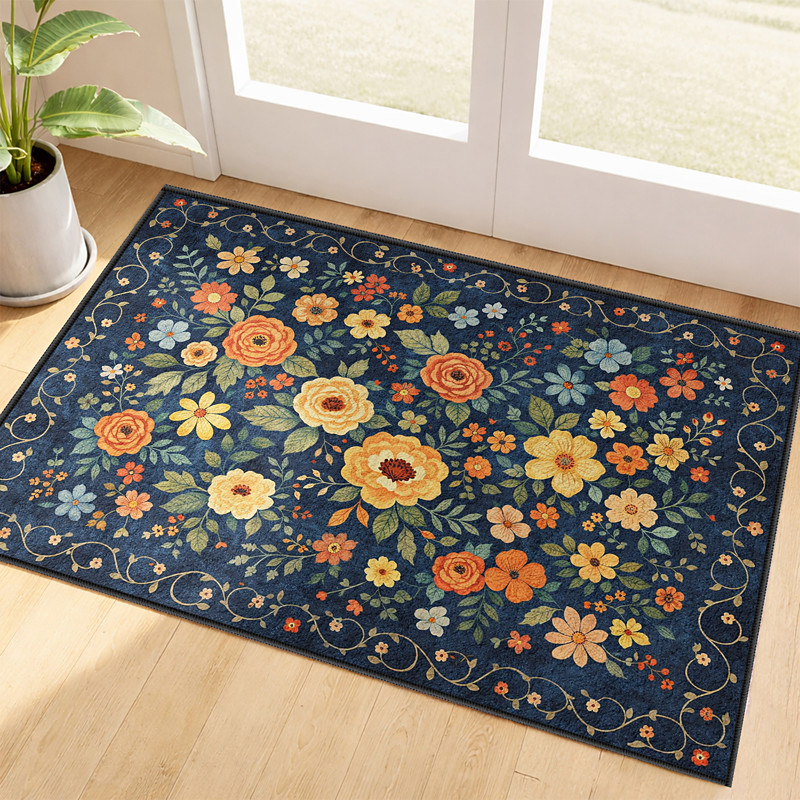 Vintage Floral Doormat Vibrant Bloom Design on Dark Blue Background Durable Decorative Entryway Rug for Home