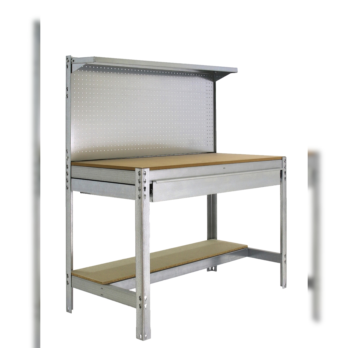 SimonRack Arbeitsbank ohne Schrauben mit Holzschalen und mit Simonwork BT3 -Boxschublade. Galva Farbe/Holz 1445x910x610 mm