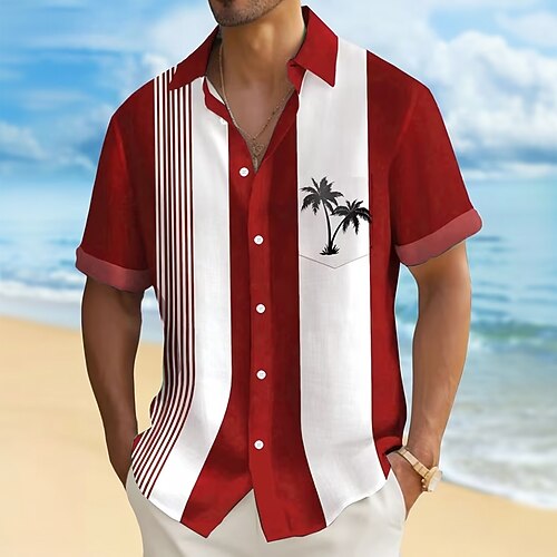 Herren Kokospalme Gestreift Tropische Pflanzen Sommer Hawaiihemd Knopfhemd Alohahemd Kurzarm Hawaiianisch Urlaub Sommer Frühling Umlegekragen 3D-Druck Hemden mit Kragen Eine Tasche vorne Blau Rote