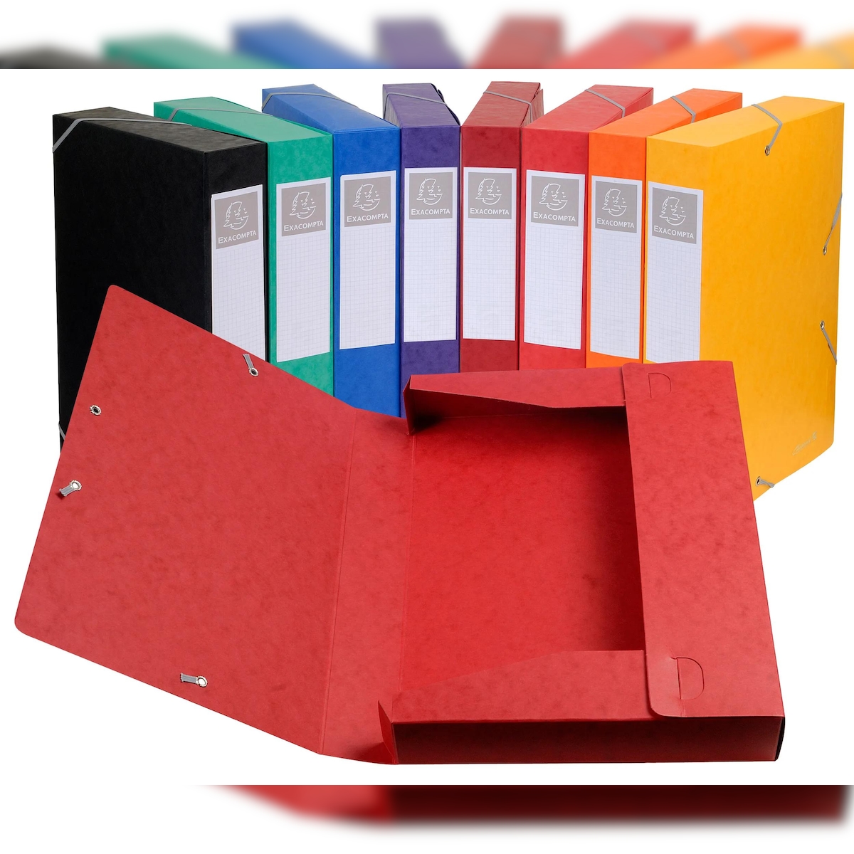 Exacompta 19500H 10x Archivbox Cartobox, flach geliefert Rücken 50mm aus Colorspan, mit 3 Klappen und Gummizug, 25x33cm für DIN A4 - Farben sortiert