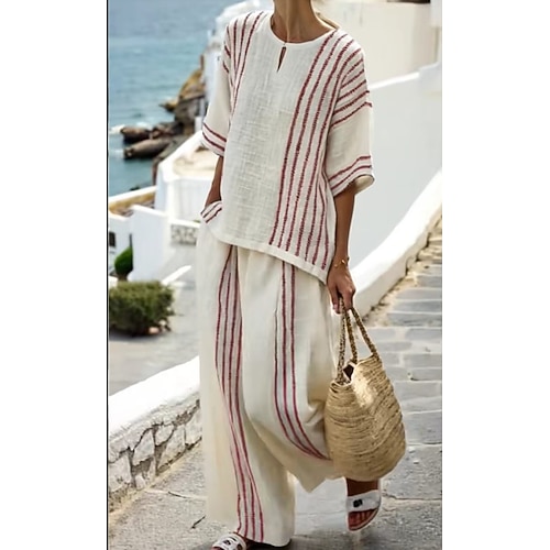Per donna maglietta A strisce Di tendenza Manica corta Rotonda Top regolari Informale Giornaliero Bottoni Stampa Nero Bianco Vino Blu Estate