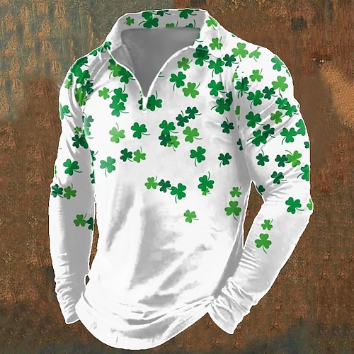 San Patrizio Per uomo Quadrifoglio Giorno di San Patrizio Polo Polo con zip Manica Lunga Magliette polo Collo ripiegato Con cerniera Casual All'aperto Giorno di San Patrizio Casual Quotidiano