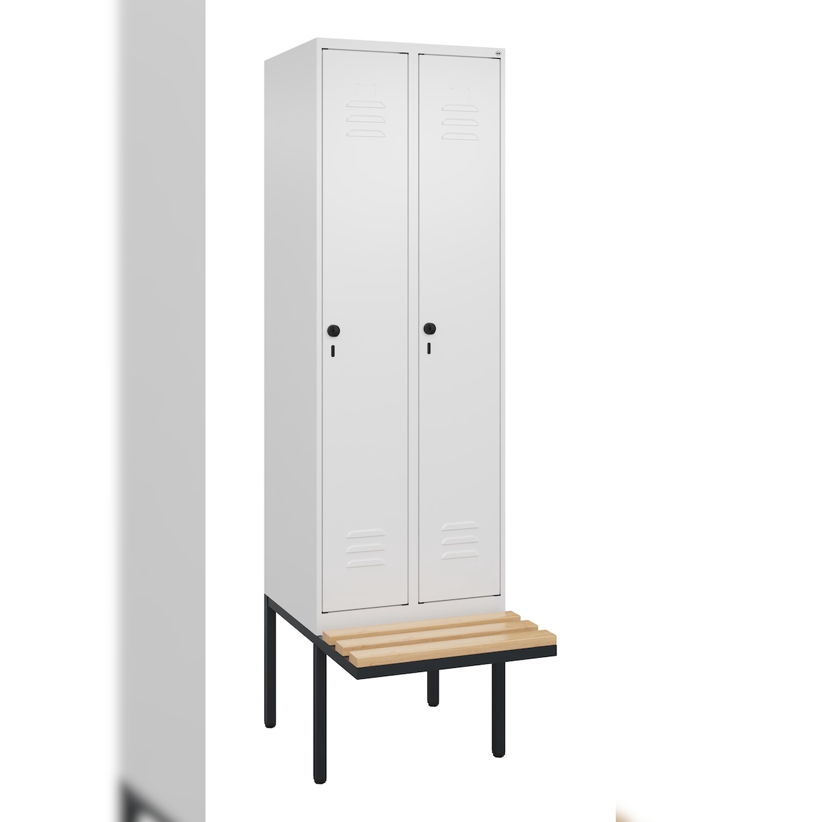 C+P Spind Classic PLUS, schwebender Sitzbank aus Buche 2 Abteile, HxBxT 212x60x82cm, Sicherheitsdrehriegel, Verkehrsweiß von PROREGAL