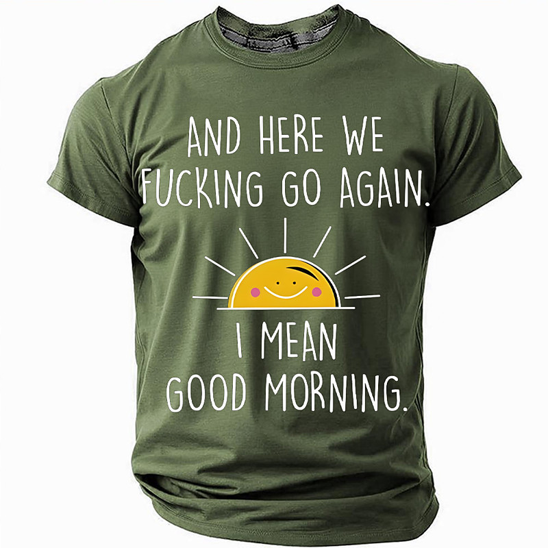 Mens Short Sleeve Graphic T-Shirt Funny Sarcastic And Here We Fing Go Again Good Morning Print
