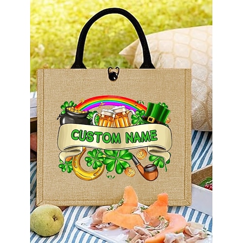 Personalisierbare St. Patrick's Day Tragetasche für Damen – festliche, umweltfreundliche Jute-Tasche mit Kleeblatt, Regenbogen und Glücksbringern, perfekt für die Feierlichkeiten.