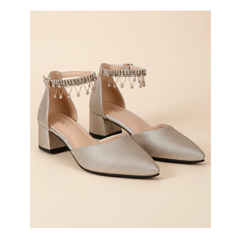 Champagne Gold Mid Heel Wedding Shoes for Mother of the Bride – Elegant Block Heel Pumps with Ankle Chain