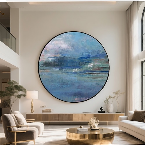 Rahmengemälde, handgefertigtes 3D-Ölgemälde mit Ozeanwellen, kreisförmige Wandkunst mit lebendiger Farbpalette, satten Blautönen und komplizierten Pinselstrichen, die eine mehrschichtige Textur für