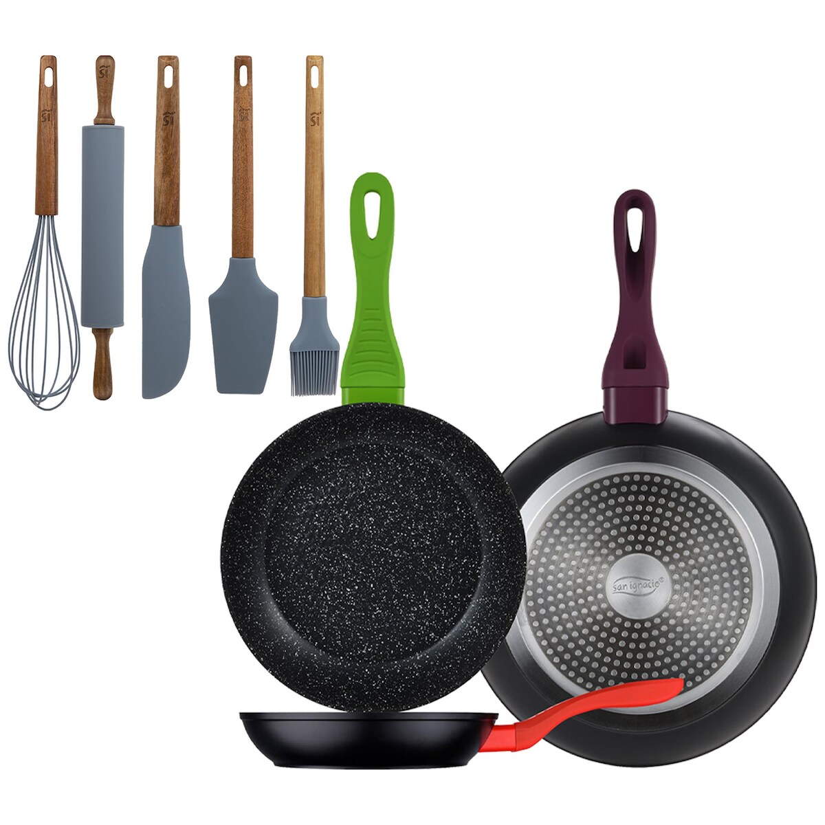 BERGNER - Set aus 3 Jolie-Pfannen Ø20/Ø24/Ø28 cm in Schwarz Set 5 Küchenutensilien aus Silikon und Holz
