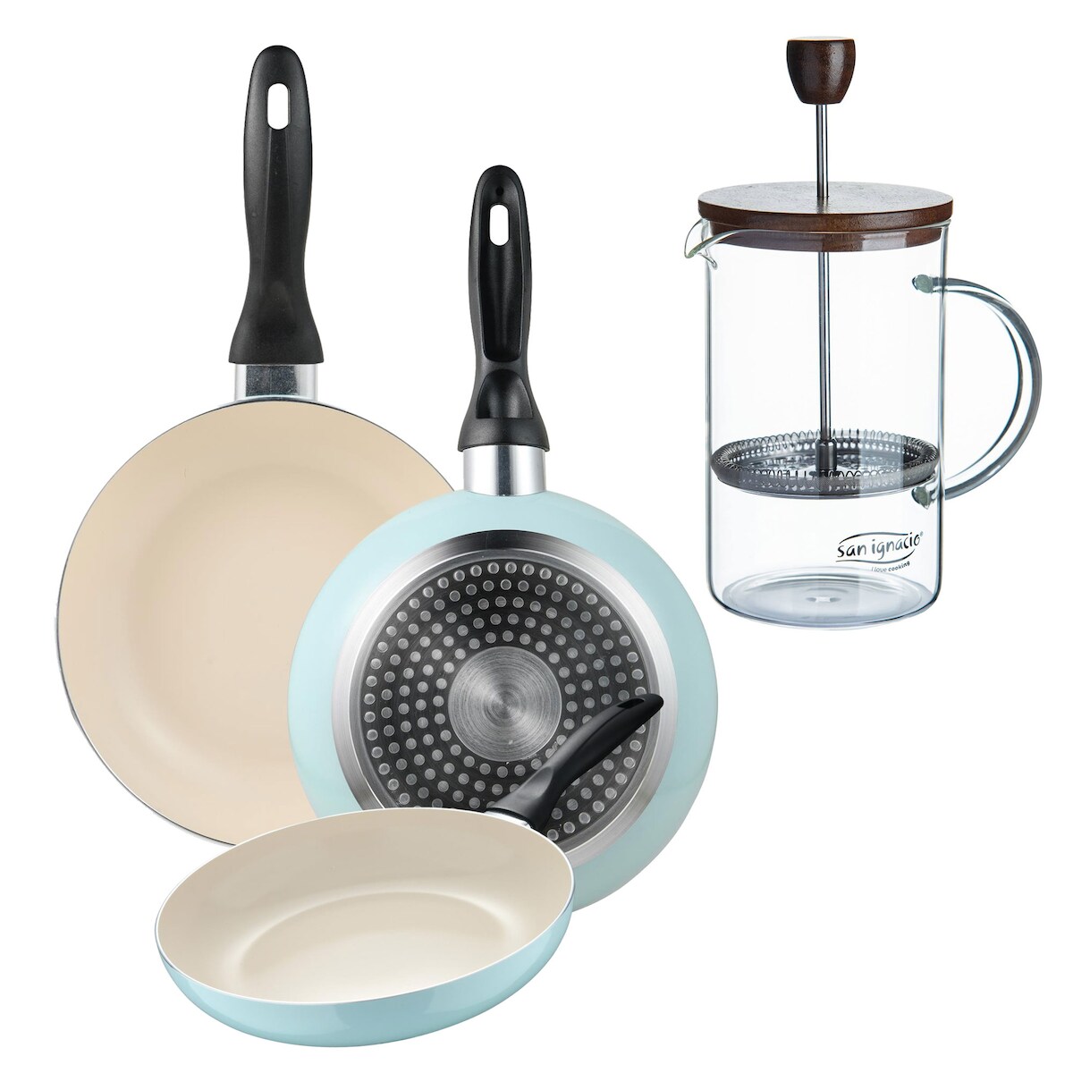 BERGNER - Set aus 3 Pfannen Ø16/Ø20/Ø24 cm gepresstes Aluminium Himmelblau Stempel-Kaffeemaschine aus Borosilikatglas 15,8×10×18,8 cm