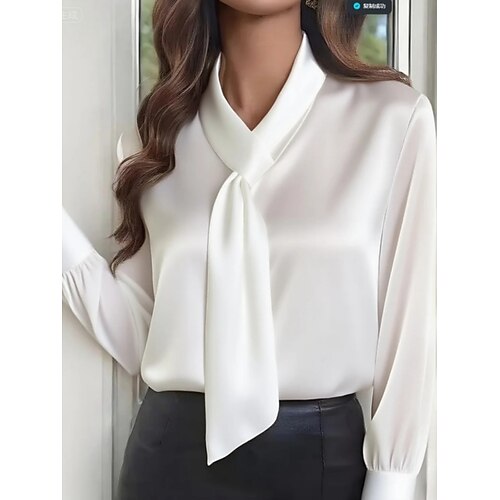 camicetta da donna in raso, arricciata, tinta unita, elegante, alla moda, da lavoro, manica lunga, collo annodato, top normali, quotidiano, da ufficio, nero, bianco, cachi, primavera, autunno