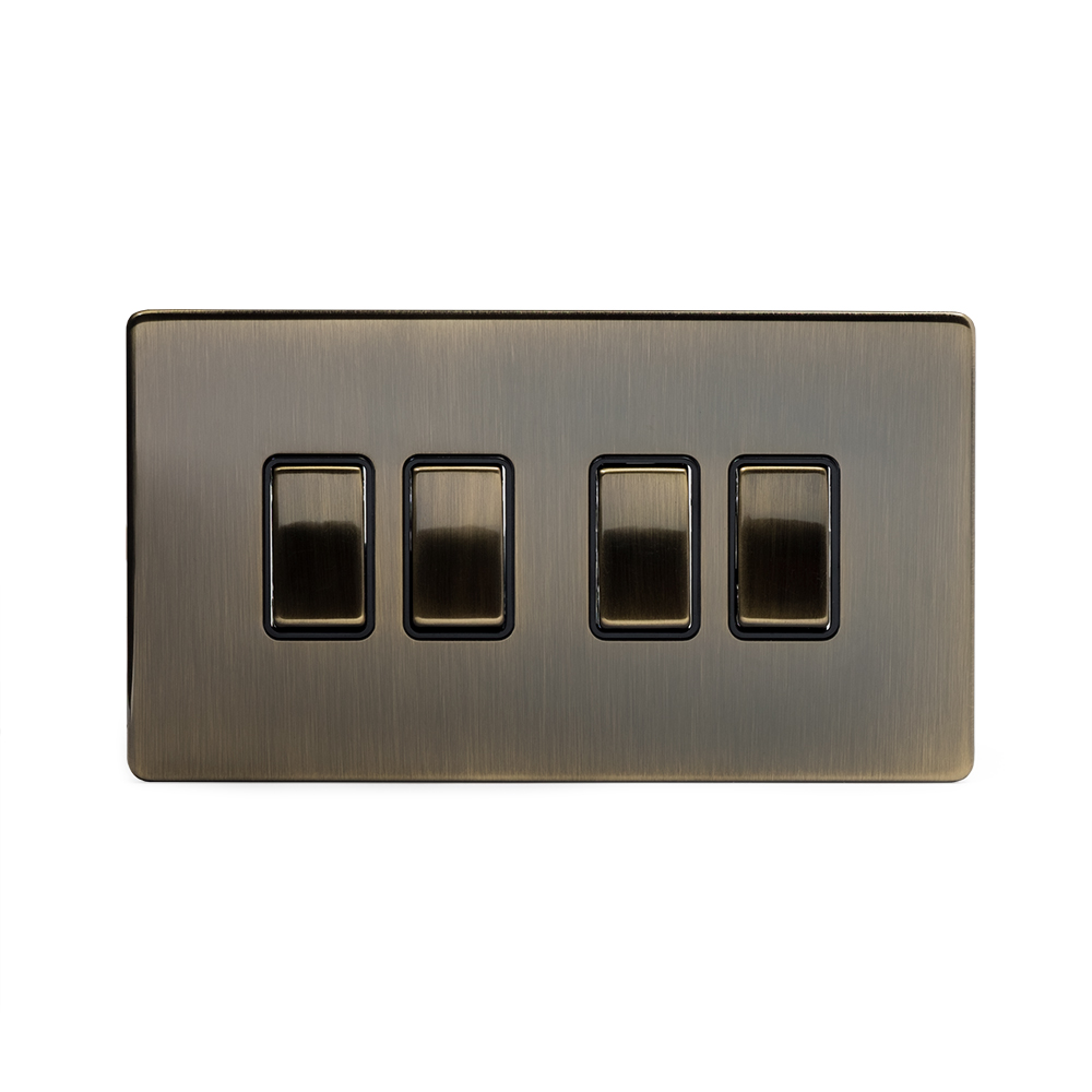 Soho Lighting Antique Brass 4 Gang 2 Way 10A Light Switch Blk Ins Screwless - Size: 86mm x 146mm x 4.5mm