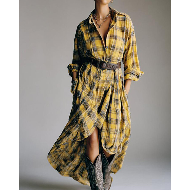 Women's Long Dress Maxi Dress Plaid Dress Shirt Dress Vintage Modern Outdoor Vacation Going out Loose Fit Plaid Long Sleeve Shirt Collar Yellow Red Spring Fall