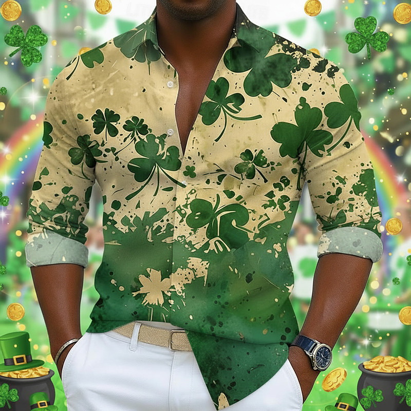 St. Patrick's Day Shirt for Men - Lucky Clover Shamrock 3D Print Long Sleeve Top with Lapel Collar Irish Graphic St. Paddy's Day Top
