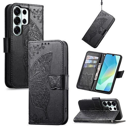 Handy Hülle Handyhüllen Für Samsung Galaxy S26 Ultra Plus S25 S24 S23 S22 S21 FE S21 Ultra Plus A54 A12 Brieftaschenhülle Flip-Cover Mit Ständer Kartenhalter Mit Handgelenkschlaufe Schmetterling
