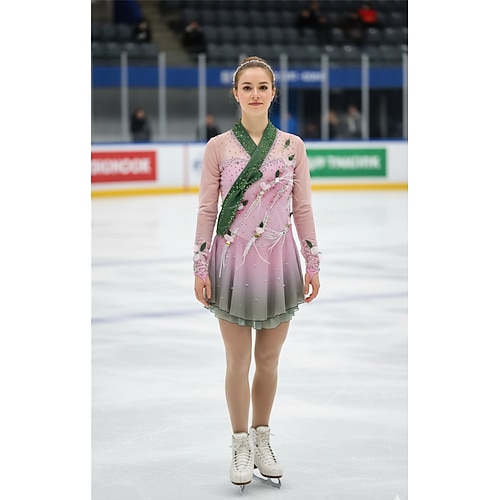 Figure Skating Dress Women's Girls' Ice Skating Dress Pink Green Patchwork Open Back Mesh Spandex Stretchy Training Practice Professional Skating Wear Thermal Warm Classic Crystal / Rhinestone Long