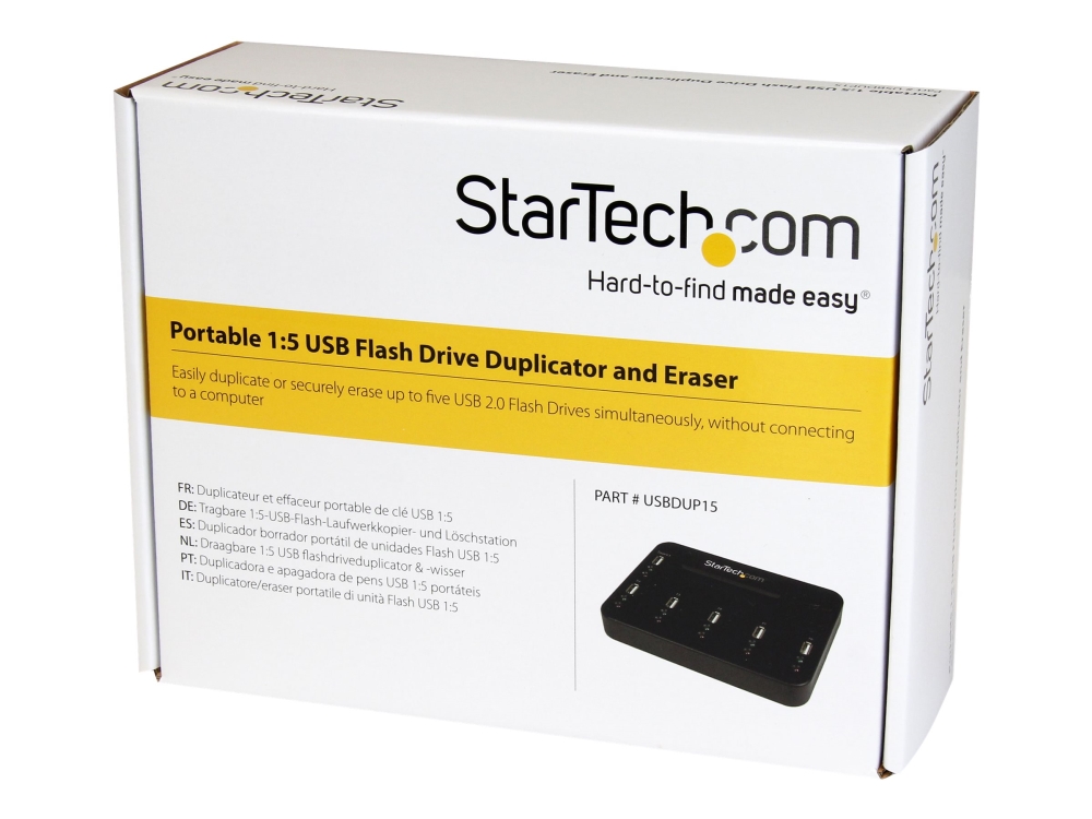 StarTech.com 1:5 USB Stick Klonstation und Löscher, Kopierer für mehrere USB Laufwerke, System and File und Sector-by-Sector Kopieren, 1,5 GB/min, Single und 3-Pass Löschen, LCD Display, 110 - 240 V, 5 V, 5 - 95%, 5 - 45 °C, -20 - 85 °C, 120 x 167 x 25 mm