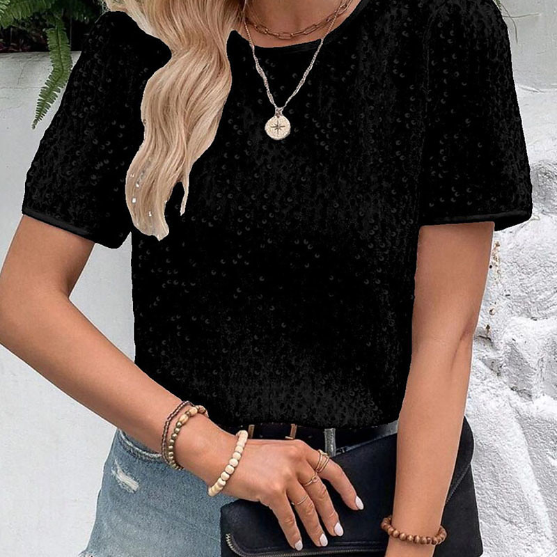 Women's T Shirt Summer Tops Solid Color Elegant Vintage Stylish Short Sleeve Crew Neck Regular Tops Daily Going out Weekend Sequins Patchwork Rose Gold Black and gray Black White Pink Summer Spring