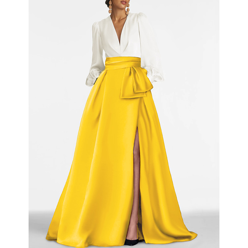 A-Line Floor Length Evening Gown Ball Gown Formal Dress Elegant Color Block High Split Long Sleeve V Neck Formal Wedding Guest Belt / Sash Satin with Slit