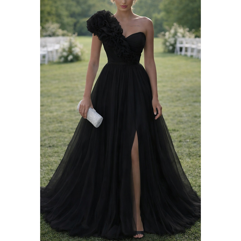 Ball Gown A-Line Floor Length Prom Dresses Elegant Sleeveless One Shoulder Prom Quinceanera Tulle Cowl Back with Embroidered Flower Ruffles Slit
