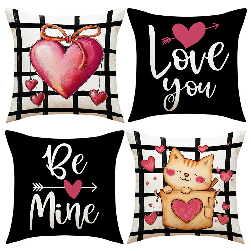 Valentine's Day Heart Pillow Cover, Black Cartoon Cat Print, Festive Bedroom Decor, Cute Heart-Shaped Cushion for Bed, Sofa, and Headboard, Cozy Valentine's Day Accent