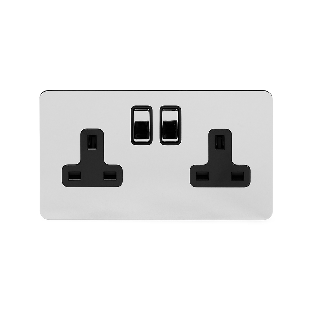 Soho Lighting Polished Chrome Flat Plate 13A 2 Gang Switched Socket Double Pole Blk Ins Screwless