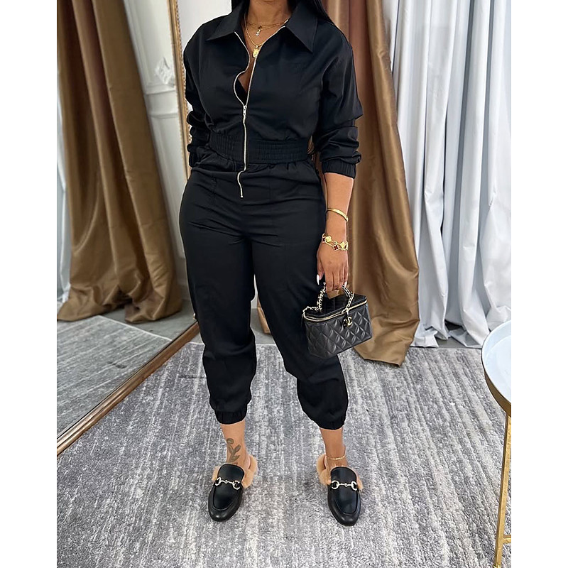 Women's Jumpsuit Active Solid Color Long Sleeve Cargo Pants Shirt Collar Zipper Pocket Vacation Daily Regular Fit Black Army Green Blue Fall