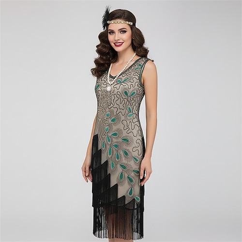Anni Ruggenti Anni 1920 Abito da cocktail Midi Abito Flapper Vestito Abito da Ballo Taglie Forti Normale Senza maniche Il grande Gatsby Charleston Invitato al matrimonio Paillettes Scollo a V Costume