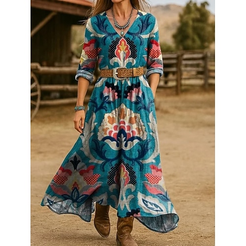 Abito Maxi da Donna Boho Vestito A-Line Vacanza Casual Andare in giro Spiaggia Vestibilità Regolare Grafica Floreale Paisley Manica Lunga V Collo Blu Viola Chiaro Marrone Verde Primavera Autunno