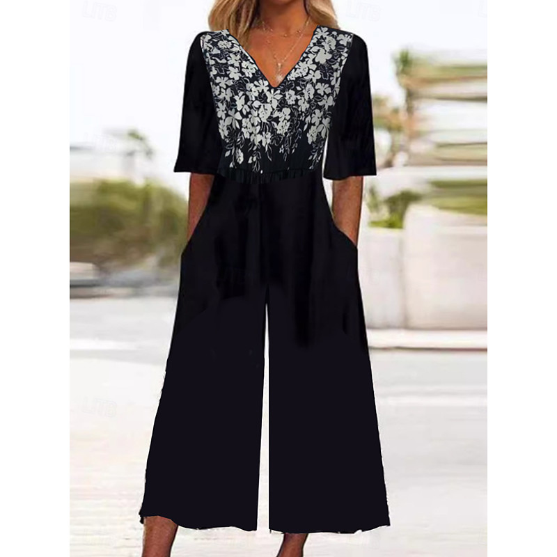 Women's Normal Jumpsuit Active Floral 3/4 Length Sleeve Wide Leg V Neck High Waist Vacation Daily Regular Fit Black Red Blue Summer