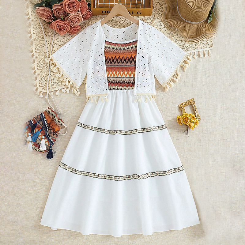 2 Pieces Kids Girls' Color Block Dress Suits Set Sleeveless Fashion School 7-13 Years Summer White