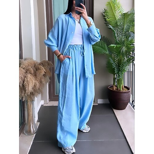 Per donna Set di Pantaloni Manica Lunga Colletto a Camicia Tinta unica Moda Streetwear Casuale Quotidiano All'aperto Blu Nero Bianco Primavera Estate Vestibilità regolare