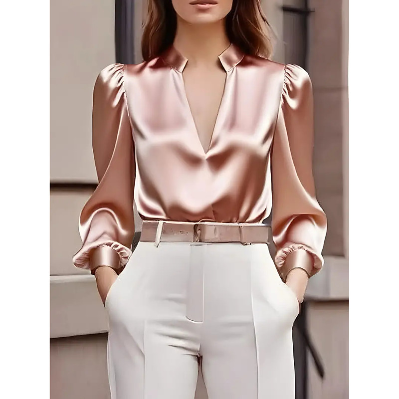 Women's Shirt Elegant Dressy Satin Plain Daily V Neck Regular Tops Black White Pink Fall