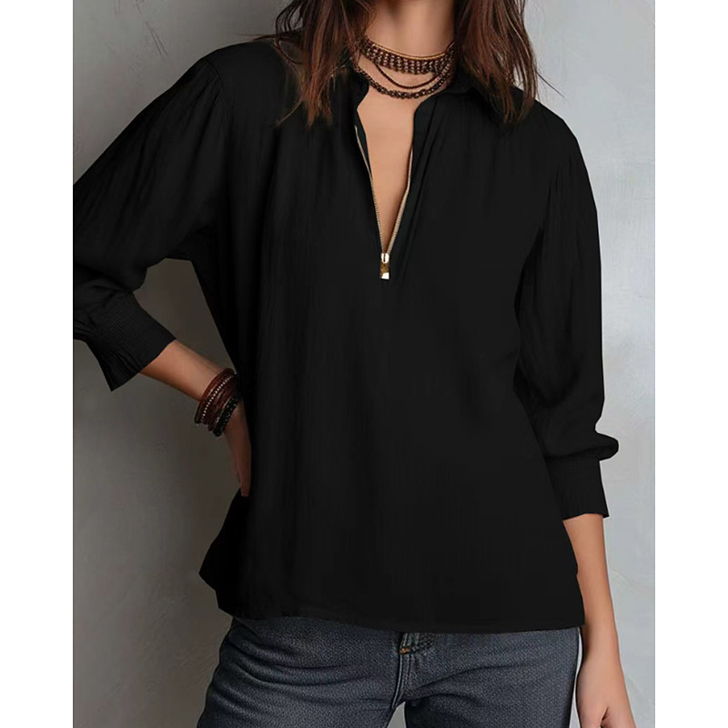 Women's Blouse Plain Vintage Stylish Long Sleeve V Neck Regular Tops Daily Holiday Going out Patchwork Zipper Black Khaki Fall Winter
