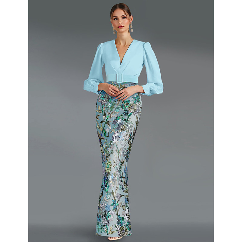 Sheath Column Floor Length Beaded Eembroidered Formal Dresses Mother of the Bride Dress Prom Dresses Evening Gown Ball Gown Formal Dress Elegant Color Block High Split Long Sleeve V Neck Wedding
