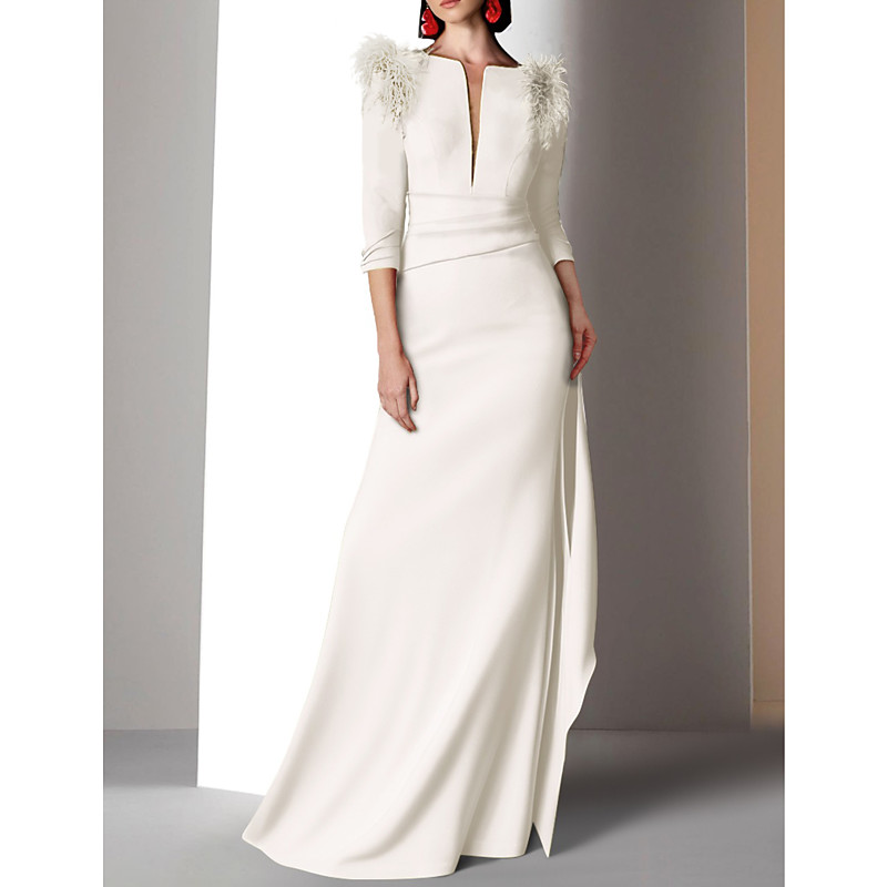 Mermaid Trumpet Floor Length Prom Dresses Evening Gown Ball Gown Formal Dress Elegant 3/4 Length Sleeve V Neck Formal Fall Satin with Feather Ruched Ruffles