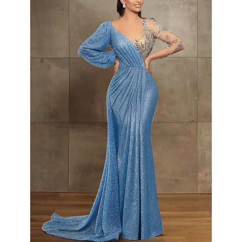 Mermaid Trumpet Court Train Evening Gown Ball Gown with Overskirt Formal Dress Elegant Long Sleeve Illusion Neck Formal Sequined with Pleats Sequin