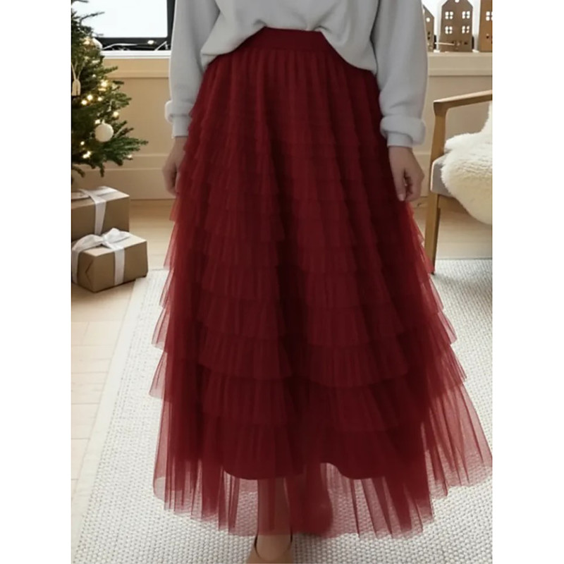 Women's A Line Elegant Maxi Mid Waist Skirts Layered Inelastic Wine Black Pink Brown Spring Tulle