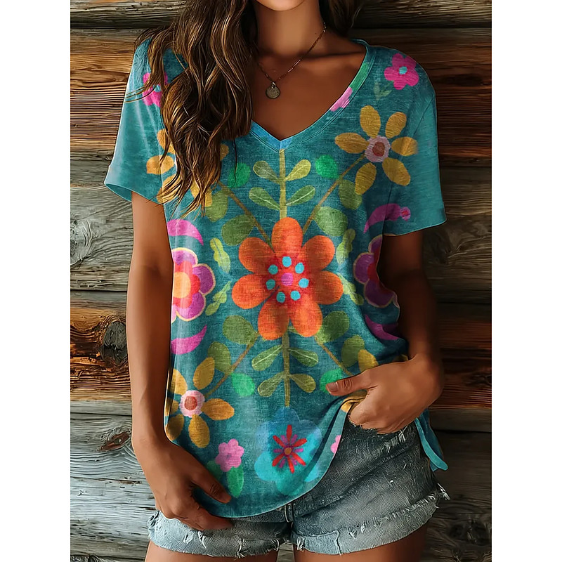 Women's T Shirt Floral Graphic Vintage Stylish Casual Short Sleeve V Neck Regular Tops Daily Print Blue Pink Purple Summer Spring