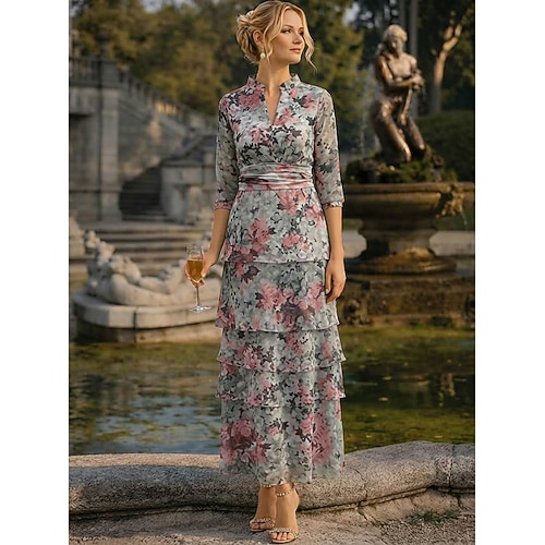 Linea ad A Abito Lunghezza alla caviglia Abito da Cocktail Abito da cerimonia per signora Manica 3/4 Scollo a V Elegante Casual Formale Ospite di nozze Ferie Chiffon con Stampa floreale Volant Balze