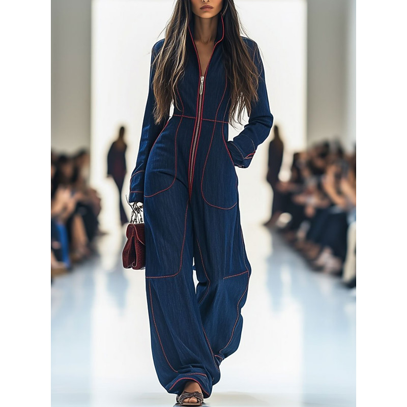 Women's Normal Jumpsuit Active Solid Color Long Sleeve Wide Leg V Neck Pocket High Waist Vacation Daily Regular Fit Blue Spring