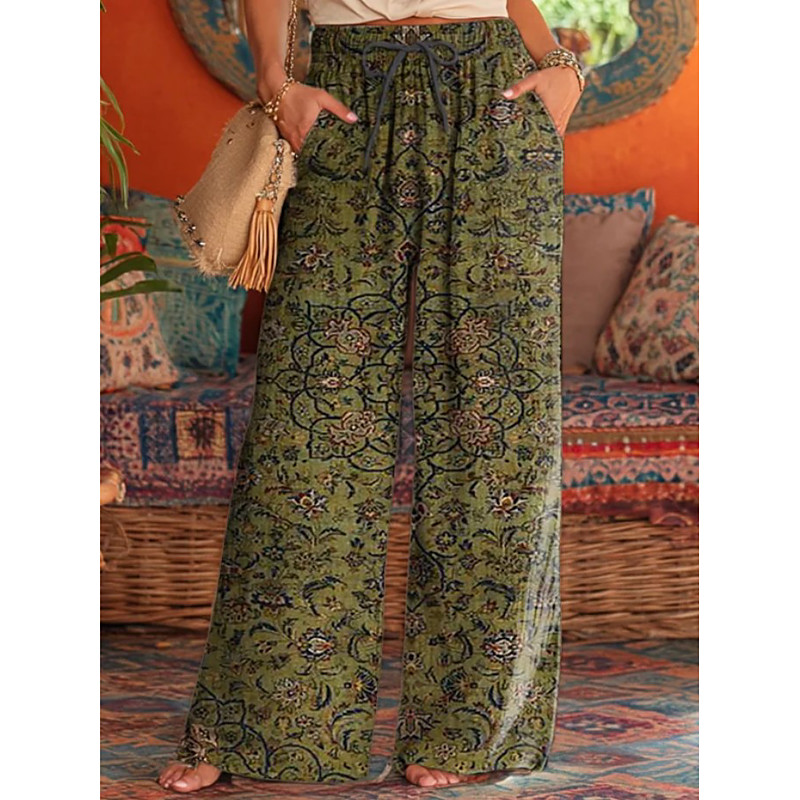 Women's Wide Leg Chinos Vacation Vintage Ethnic Style Full Length High Waist Drawstring Patchwork Printing Inelastic Dailywear Holiday Black Light Green Cream Dark Green Summer Spring Fall Loose Fit