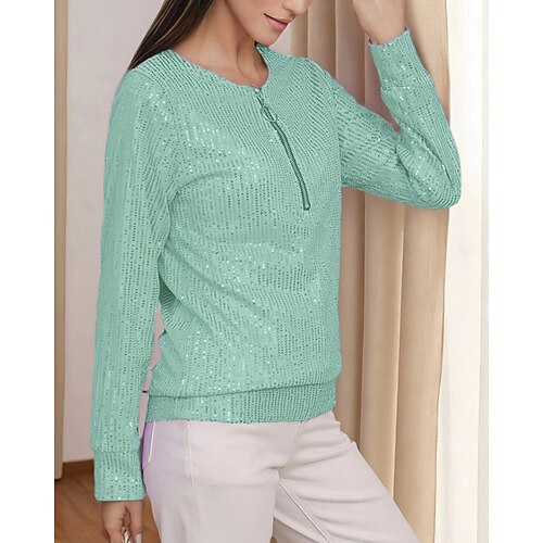 Per donna Maglietta Semplice Moda Moderno Manica Lunga Girocollo Top Regolari Quotidiano Paillettes Zip a un quarto Nero Bianco Giallo Viola Verde Primavera Autunno