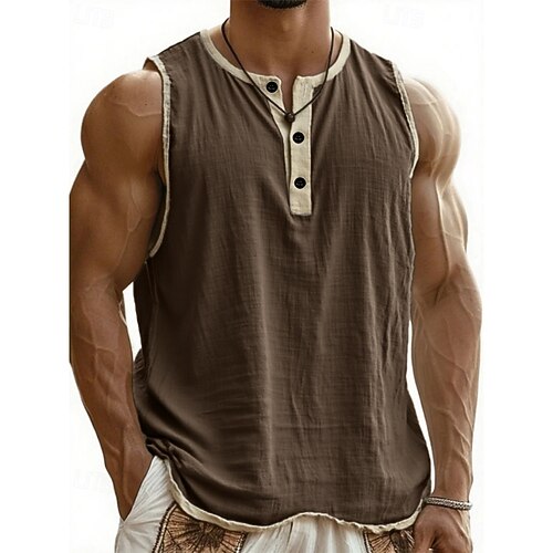 Herren Leinenhemd Tank Top Weste Unterhemd Ärmellos Rundhals Mandarinkragen Sommer Frühling Sommer Einfach Mode Designer Basic Knöpfe Knopf vorne Lässig Urlaub Straße Hellblau Schwarz Rosa Top
